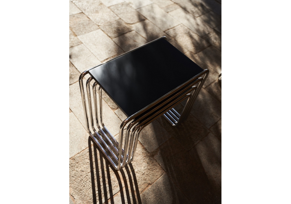 B 9 firmato da Marcel Breuer per Thonet è un tavolino d'appoggio con struttura in tubolare d'acciaio cromato o verniciato in differenti colori. Piano in MDF, faggio o vetro. Disponibile in diverse finiture e dimensioni.