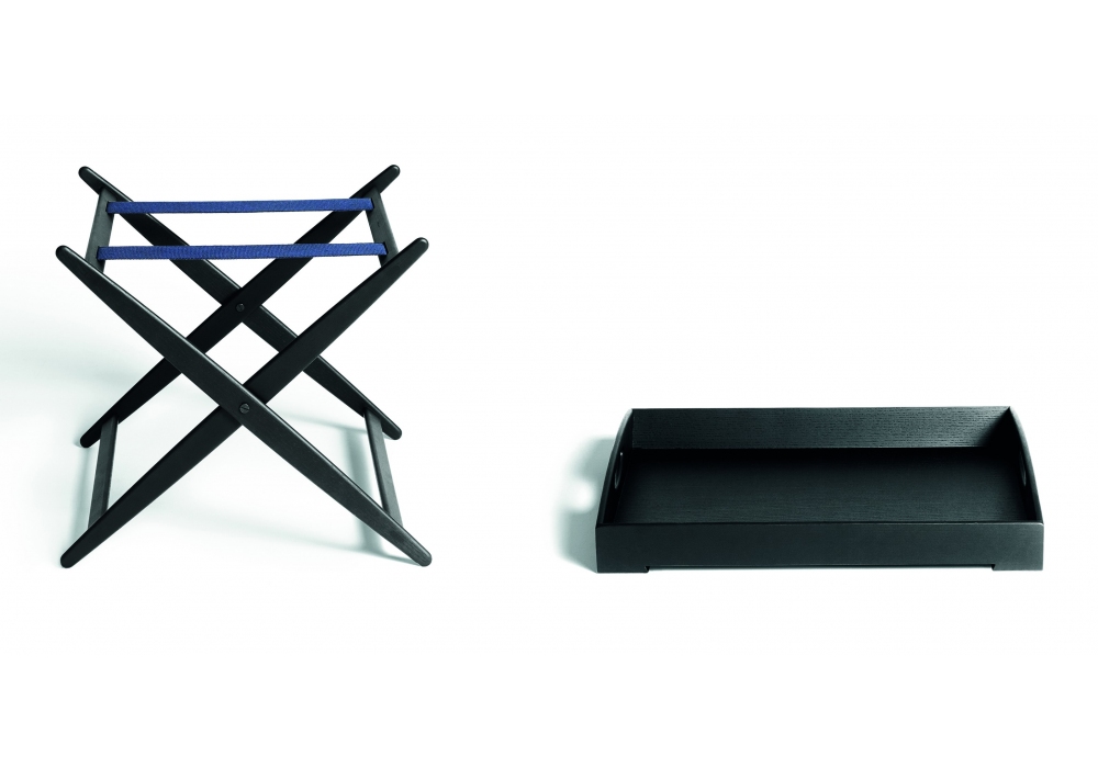 Mate firmato da Achille Castiglioni per DePadova è un tavolino con base pieghevole e struttura in massello di faggio naturale o massello di frassino color carbone e cinghie in cotone di colore blu. Piano in multistrato di betulla.