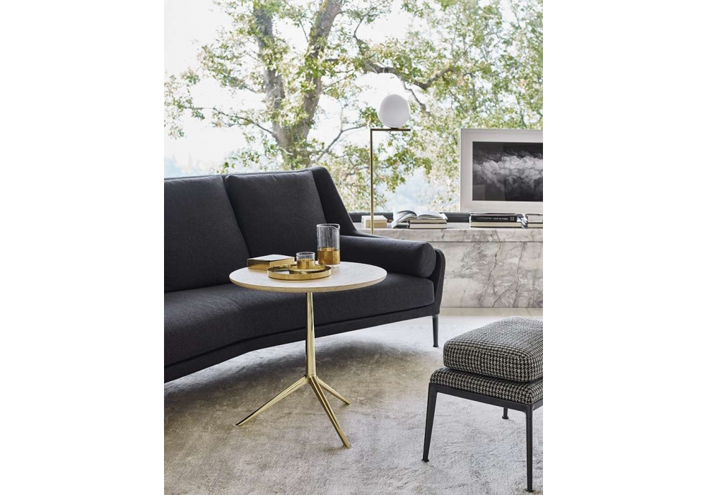 Cozy firmato da Antonio Citterio per B&B Italia è un tavolino con struttura in ottone e piano in pannello in fibra di legno MDF impiallacciato, vetro o marmo in differenti finiture.