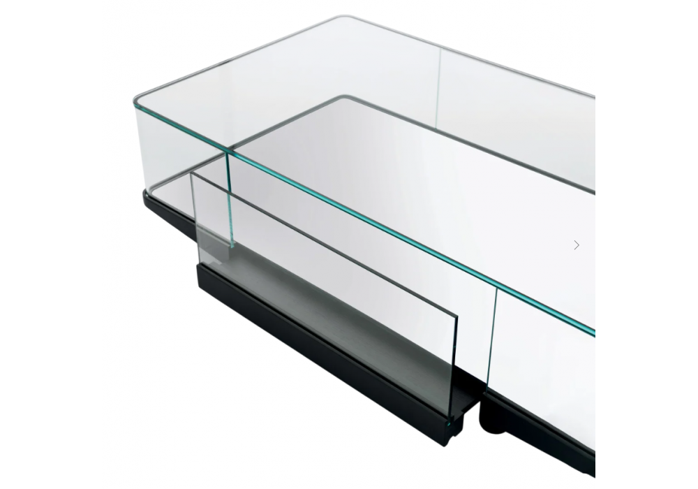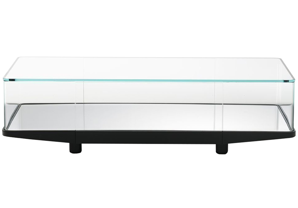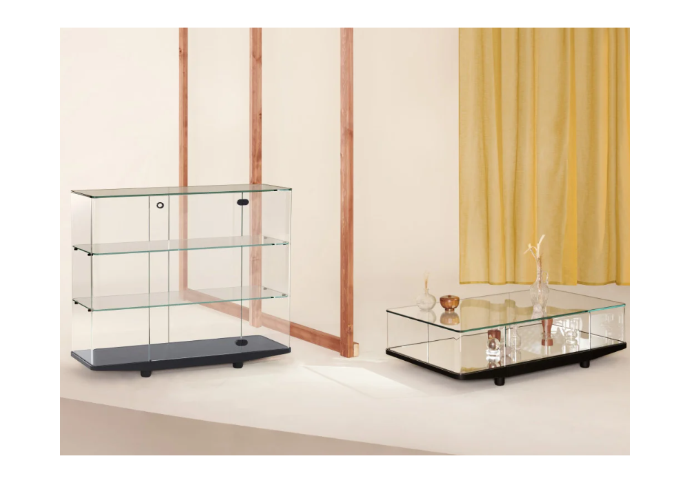 Collector firmato da Edward Barber & Jay Osgerby per Glas Italia è un tavolino con fianchi e top in cristallo trasparente extralight. La base è in massello di frassino laccato nero poro aperto con uno specchio incassato a filo.
