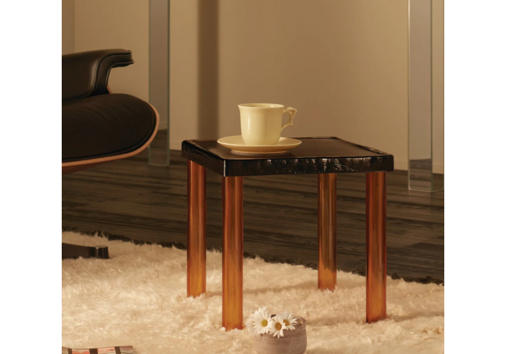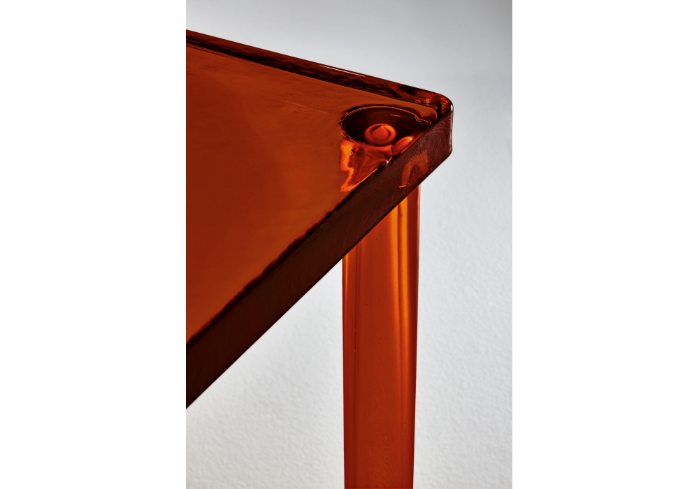 Nesting firmato da Ronan & Erwan Bouroullec per Glas Italia è un tavolino quadrato con piano in vetro colato di grosso spessore e gambe cilindriche in vetro soffiato, disponibili in cristallo trasparente, colorato ambra, verde chiaro e verde scuro. Grazie a complesse lavorazioni, le gambe vengono affondate e saldate nello spessore del top in totale trasparenza. Disponibile anche in 3 diverse dimensioni.