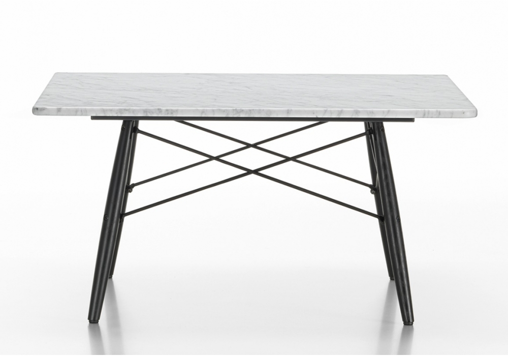 Eames Coffee Table firmato da Charles & Ray Eames per Vitra è un tavolino disponibile in due diverse dimensioni. Piano in legno laminato con impiallacciatura di alta qualità, marmo di Carrara spazzolato e cerato o legno massello con finitura oliata. Basamento in frassino massello, montanti a barre di acciaio incrociate.