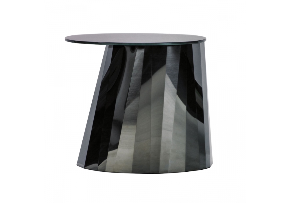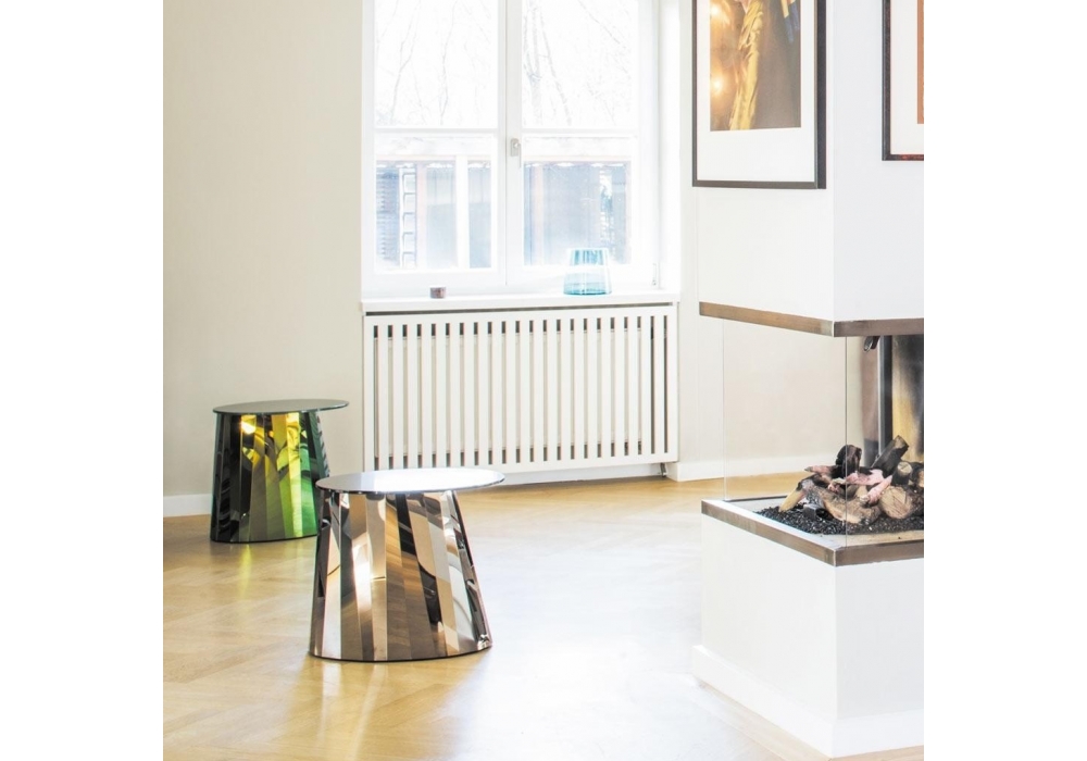 Pli firmato da Victoria Wilmotte per ClassiCon è un bellissimo tavolino con base realizzata in lamiera lucida d'acciaio inox, disponibile in vari colori applicati tramite una particolarissima lavorazione. Top ovale in cristallo. Pattini in feltro nero.
