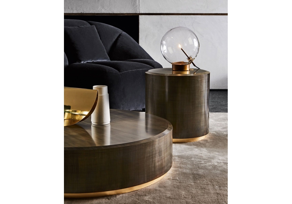 Gong firmato da Studio G&R per Gallotti&Radice è un tavolino in legno bisellato e decorato con lavorazione manuale ed esclusiva, disponibile nella versione "Autumn Weave" su base foglia oro oppure "Carbon Black" su base foglia rame. Basamento in legno rivestito foglia oro. Disponibile anche versione "Winter Weave" su base foglia argento con basamento in legno rivestito in foglia argento.