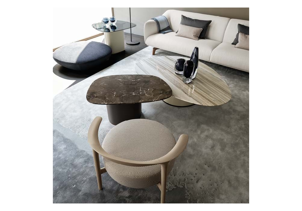 Galet firmato da Ludovica & Roberto Palomba per Giorgetti è un tavolino con la base rivestita in pelle, con colore a scelta, e crociera in metallo verniciato color bronzo effetto naturale. Il piano è disponibile nelle versioni: massiccio e impiallacciatura di noce canaletto, laccato lucido con effetto sfumato nei colori colori grigio chiaro, grigio scuro, arancio, viola, cedro e nocciola, marmo nelle varianti calacatta oro, Portoro, zebrino o Velvet Brown, cristallo temperato nei colori grigio o bronzo.