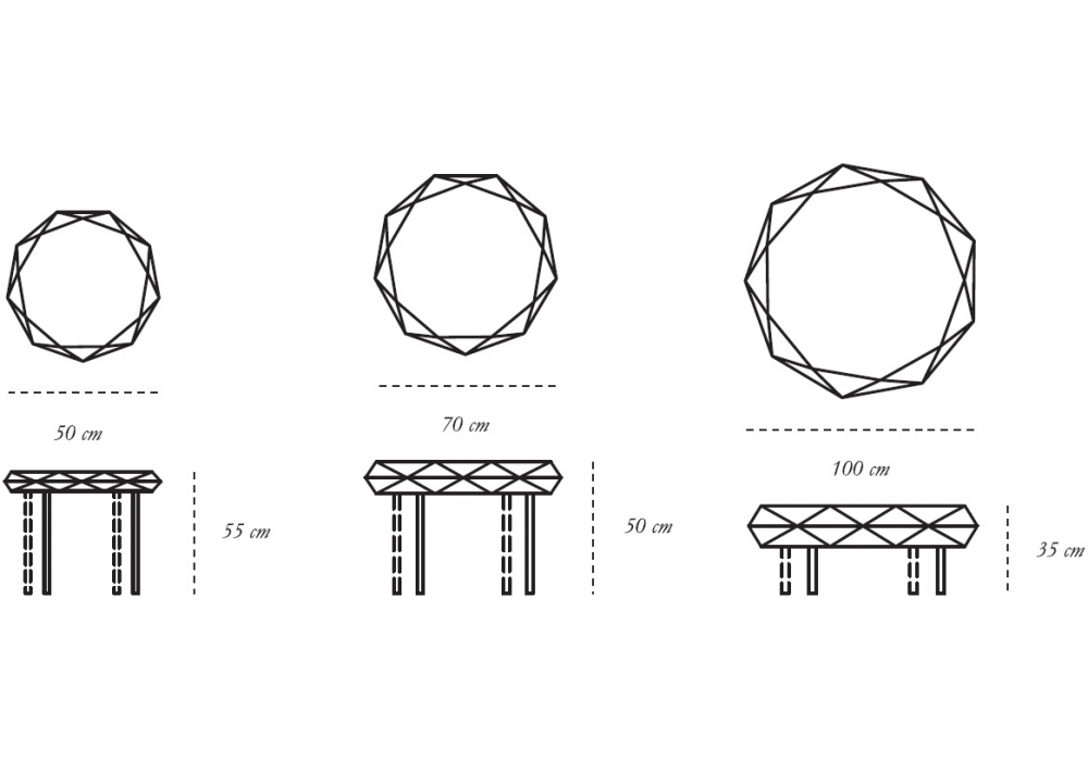 | Dimensioni | Ø 50 x H 55 cm; Ø 70 x H 50 cm; Ø 100 x H 35 cm. |