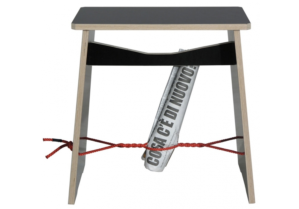 Strammer Max firmato da Max Frommeld per Moormann è uno sgabello/tavolino in compensato di betulla disponibile in 2 diverse finiture: bianco e nero. Corda rossa in poliestere. Il bastoncino in frassino può essere sostituito con un oggetto a piacere.
