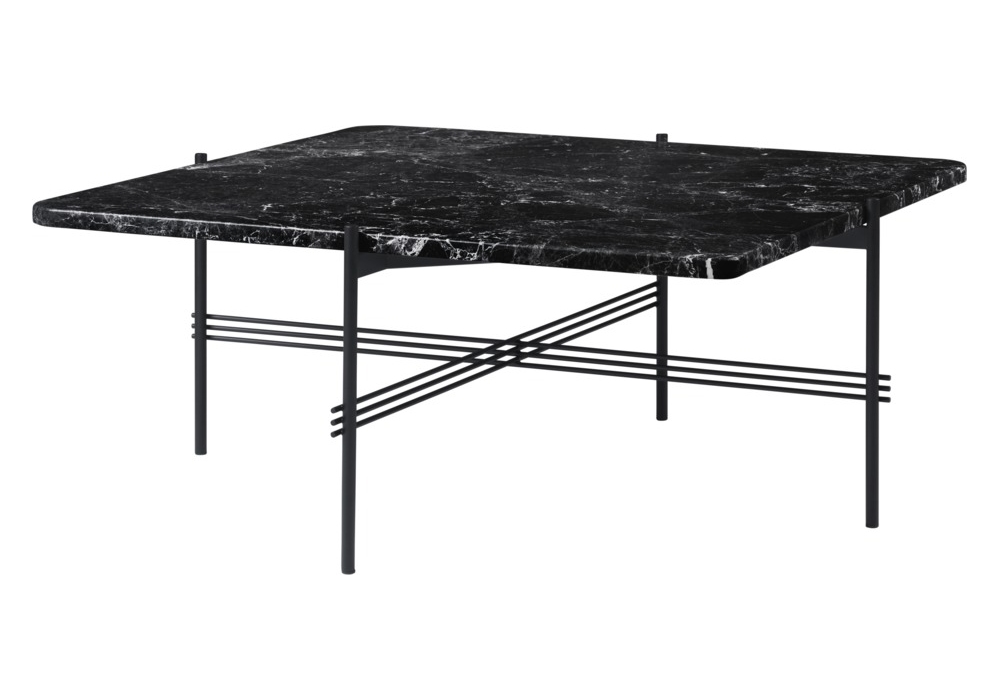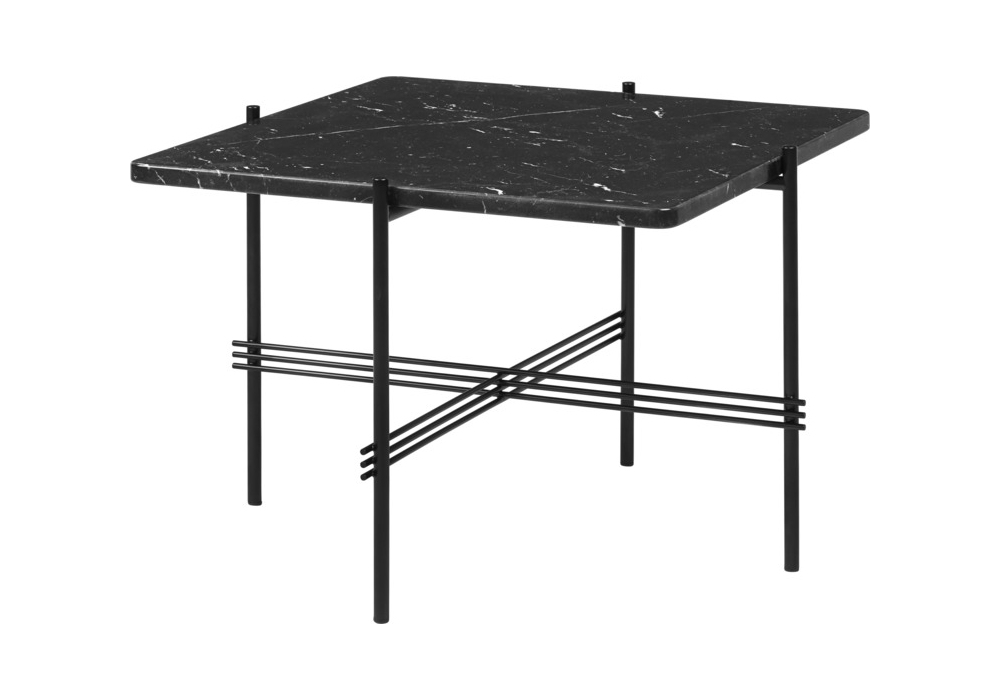 Ts firmato da GamFratesi per Gubi è un tavolino quadrato con struttura verniciata nera e piano in marmo. Disponibile in diverse finiture e dimensioni.