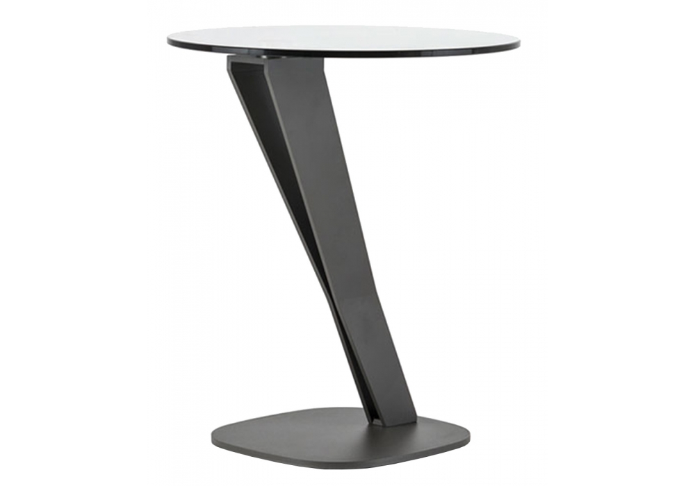 Falco firmato da Emanuele Zenere per Cattelan Italia è un tavolino d'appoggio con base in acciaio verniciato goffrato graphite e piano in cristallo disponibile in due finiutre: trasparente e fumè.