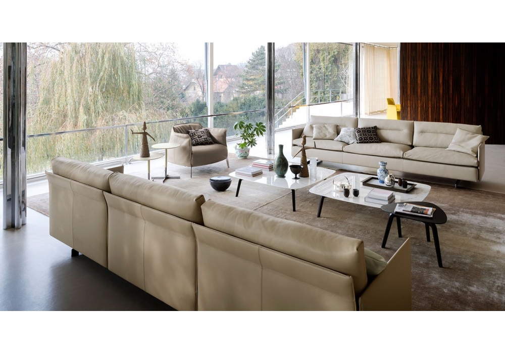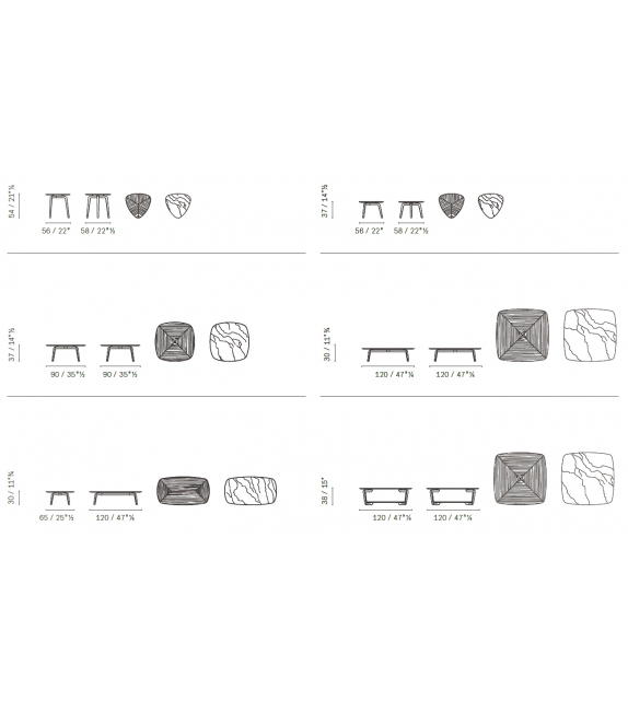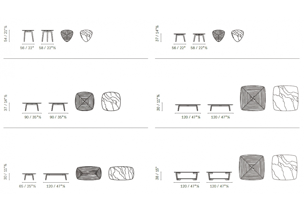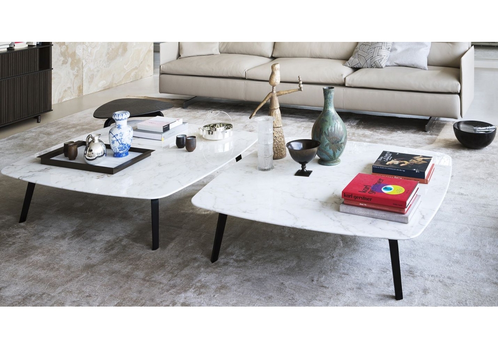 Poltrona Frau Fiorile tavolino: Un triangolo. Un quadrato. Un rettangolo. Gli angoli stondati, le linee morbide, discrete, quasi organiche. Più tavolini riuniti insieme, creano giochi geometrici ogni volta diversi, grazie anche ai piani sfalsati su differenti altezze, dando movimento ed eleganza allo spazio.