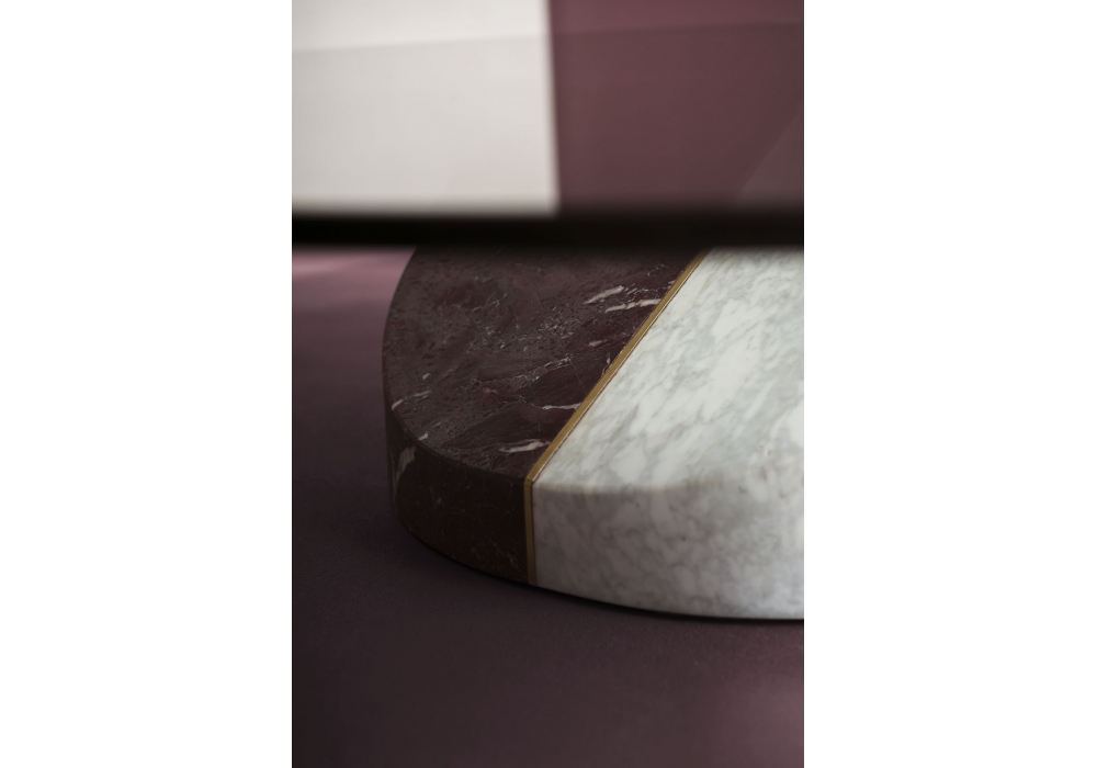 Ziggy firmato da Pietro Russo per Baxter è un tavolino con base in marmo: Bianco Gioia / Rosso Lepanto e piano in vetro fumée. Disponibile in 2 dimensioni.