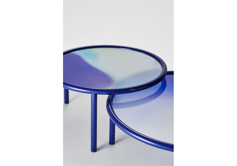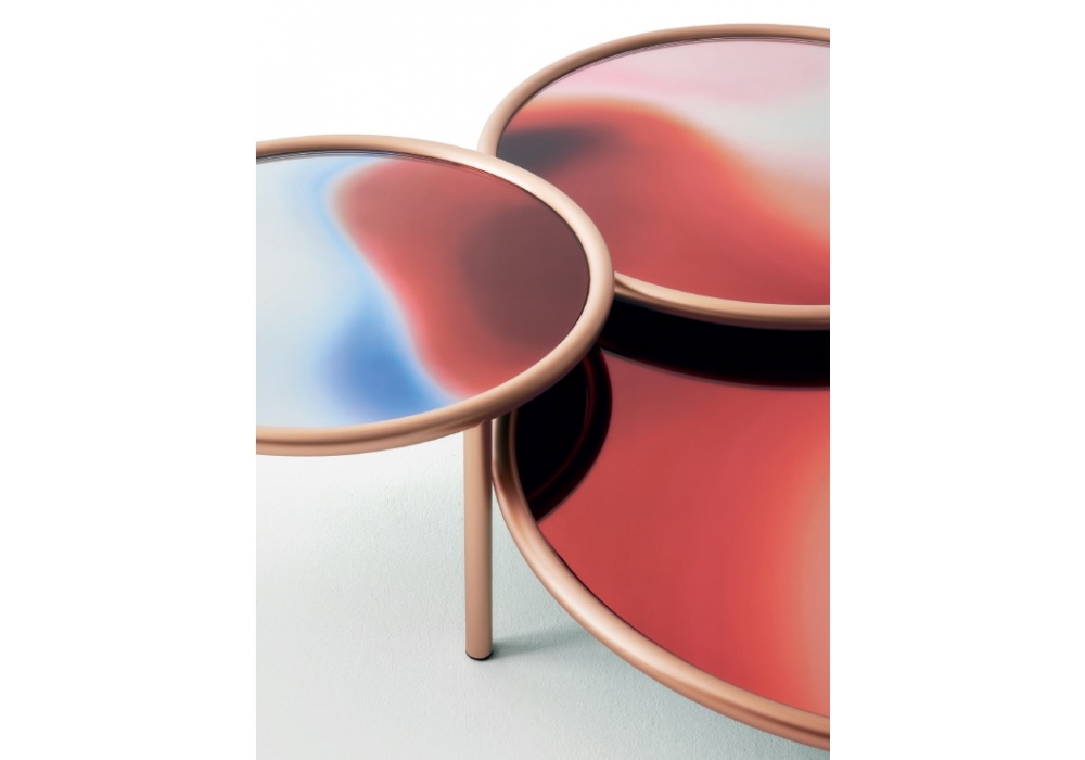 L.A. SUNSET firmato da Patricia Urquiola per Glas Italia è un tavolino con struttura in tubo metallico e piani in vetro stratificato opalino. I colori del piano sfumano e si fondono tra loro come gas o fluidi. Disponibile in tre dimensioni.