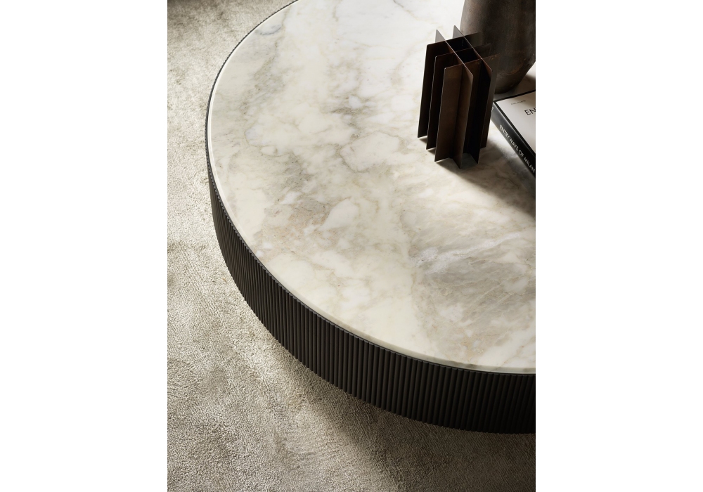 Nori firmato da Studio G&R per Gallotti&Radice è un tavolino in legno massello tinto nero, rivestito con fascia zigrinata a mano. Piano in pelle Fard nei colori del campionario. Disponibile versione con piano in marmo nelle finiture lucido naturale Calacatta Vagli Oro, Verde Alpi, spazzolato Fior di Pesco oppure versione con piano in legno “Rosso Marte” oppure verniciato nella finitura esclusiva bronzo antico e piombo oppure verniciato con finitura esclusiva spazzolata “Cashmere” gold grey o anthracite. Zoccolo in ottone brunito a mano oppure ottone brunito scuro.