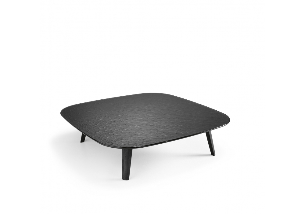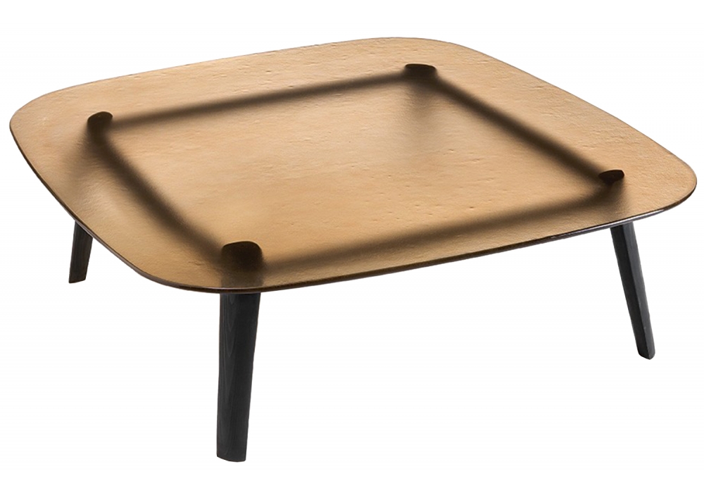 Magma firmato da Patrick Jouin per Fiam è un tavolino con piano in vetro fuso a gran fuoco, temperato e retroverniciato con tinte semi-trasparenti, metallizzate oppure in marmo. Base in legno massello in finitura tabacco o termotrattatato nero.