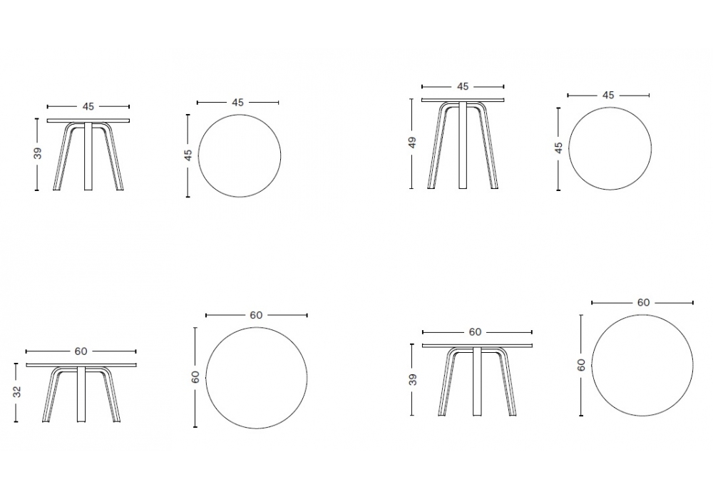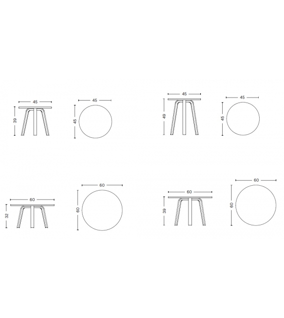 | Dimensioni | Ø 45 cm x H 39 cm; Ø 45 cm x H 49 cm; Ø 60 cm x H 32 cm; Ø 60 cm x H 39 cm. |