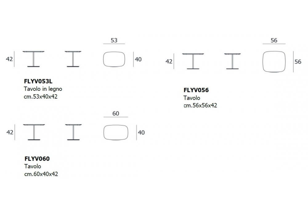 | Dimensioni | 53 x 40 x H 42 cm; 56 x 56 x H 42 cm; 60 x 40 x H 42 cm |