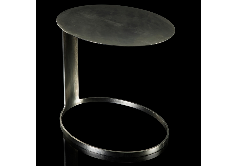 Poke firmato da Massimo Castagna per Henge è un tavolino a forma di C in lamiera disponibile nelle seguenti finiture: acciaio brunito nero, platino brunito e titanio brunito.