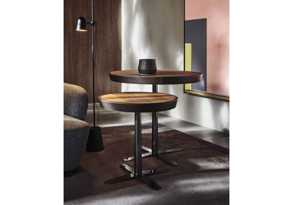 Kew firmato da Rodolfo Dordoni per Molteni&C è un tavolino rotondo con piano proposto in marmo Grigio Oriente e Calacatta Oro e in legno nelle seguenti essenze: eucalipto, rovere grafite e noce. Il bordo del piano è in pelle Pandora. Struttura in metallo in peltro lucido.