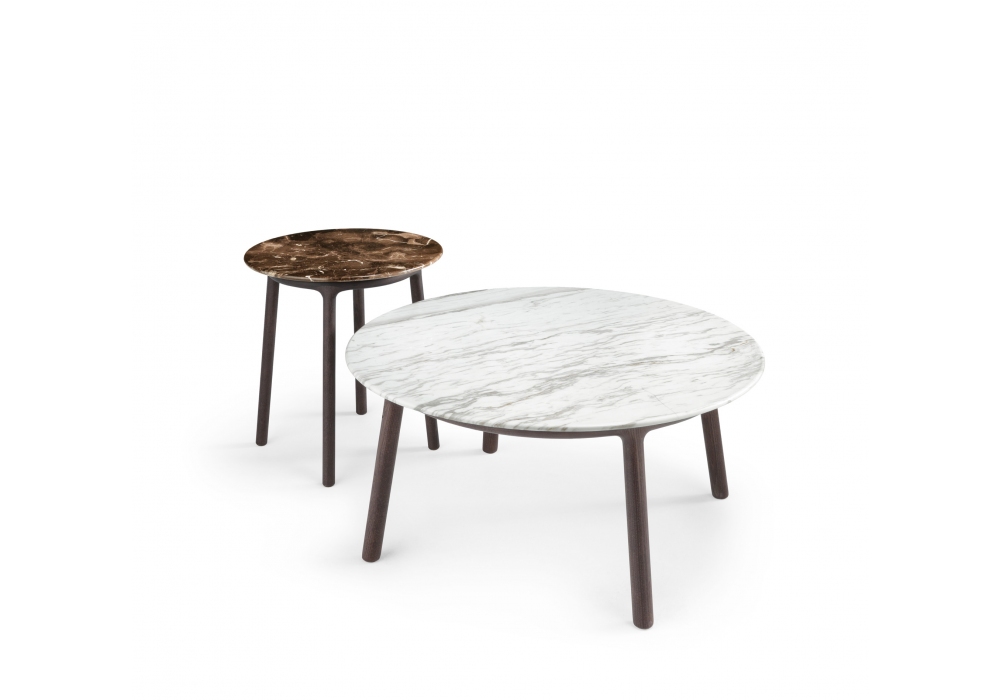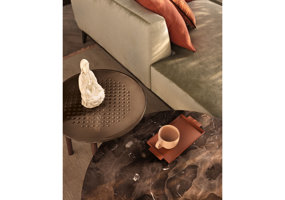 Cannage firmato da Emmanuel Gallina per Fiam è un tavolino con struttura in massello di rovere a poro aperto color tabacco. Piano in vetro temperato e fuso con texture “Cannage”, disponibile trasparente o retroverniciato con finiture semitrasparenti o con vernici metallizzate. Piano disponibile anche in marmo.