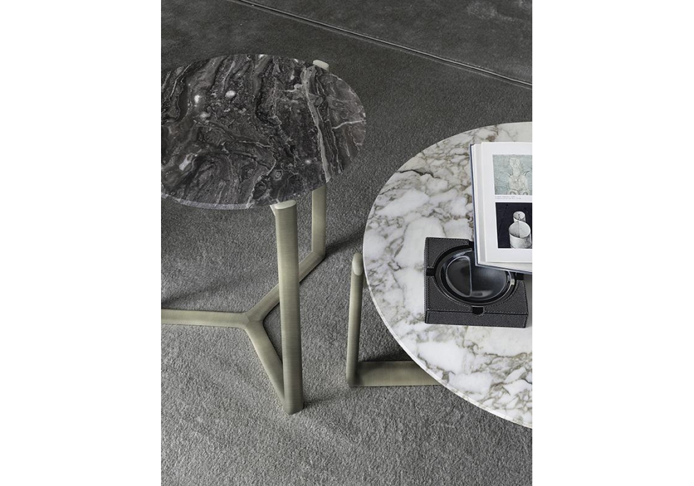 Arne firmato da Roberto Lazzeroni per Casamilano è un tavolino con struttura in fusione di alluminio naturale, spazzolata, prodotta con metodo in sabbia naturale in finitura platino. Piano realizzato in marmo.