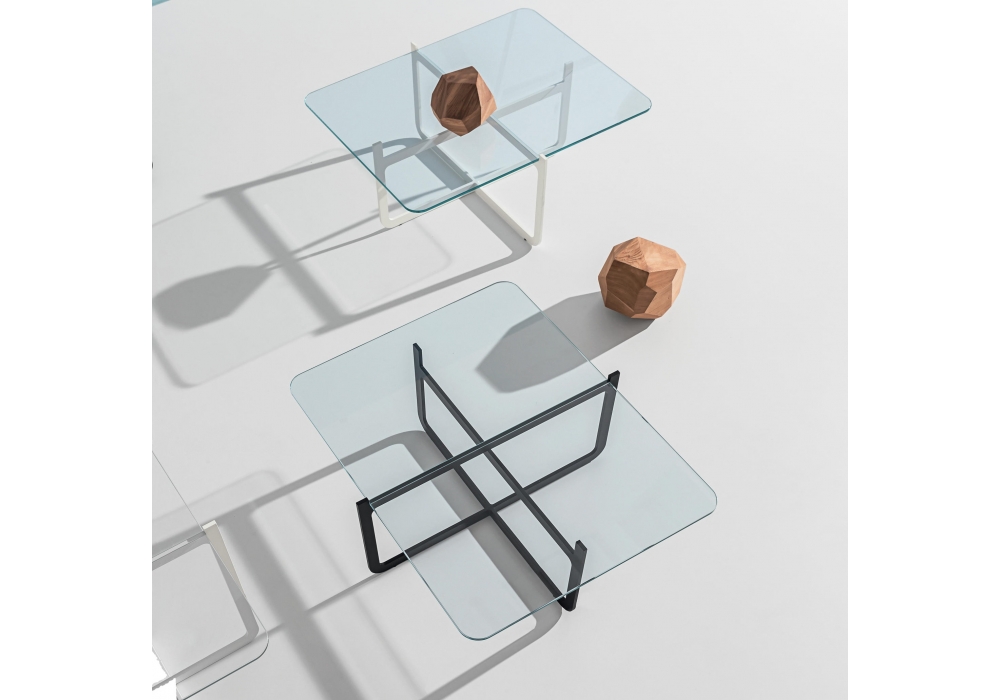 Clip firmato da Nendo per Discipline è un tavolino basso con piano in vetro trasparente extrachiaro temperato. Struttura in lamiera di metallo tagliata a laser, saldata e verniciata. Disponibile in diverse finiture e dimensioni.