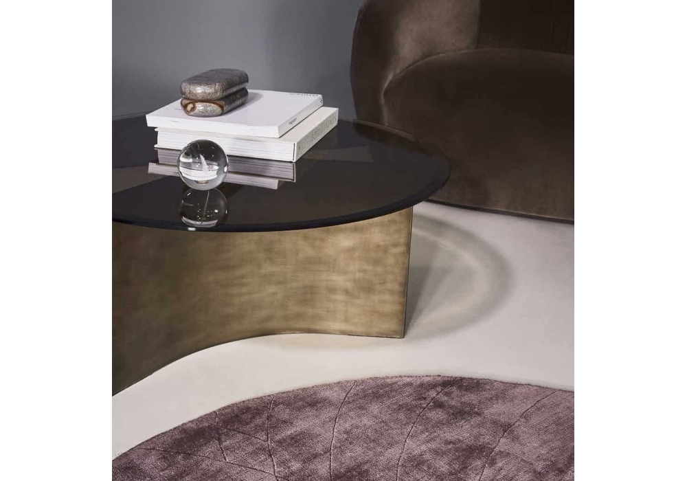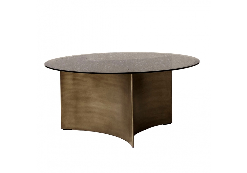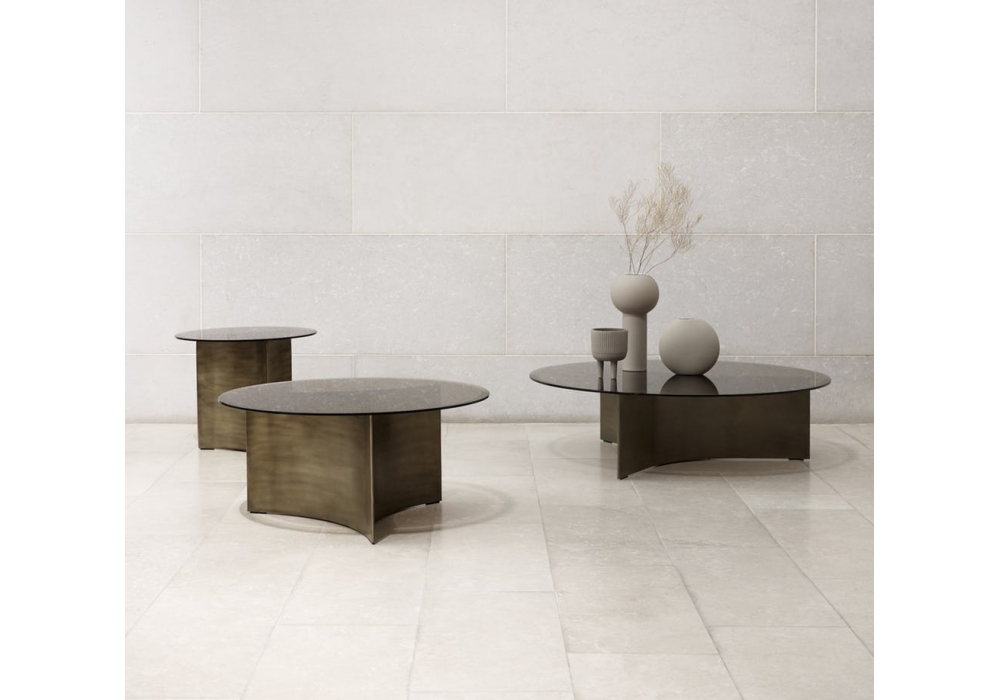 ARC firmato da Toan Nguyen per wendelbo è un tavolino con base in acciaio patinato bronzo e piano in vetro affumicato. Disponibile in 3 modelli.