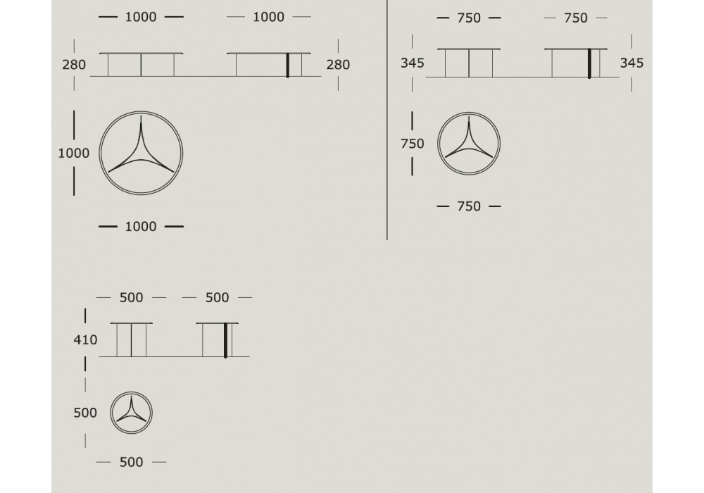 | Dimensioni | ⌀ 50 x H 41 cm; ⌀ 75 x H 34,5 cm; ⌀ 100 x H 28 cm. |