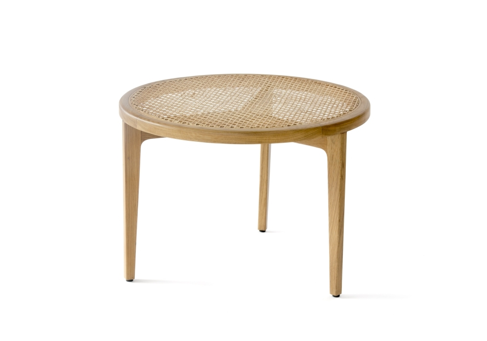 Le Roi firmato da Kristian Sofus Hansen e Tommy Hyldahl per Norr11 è un tavolino in legno di rovere con il top in rattan, Ø 60 cm x H42 cm.