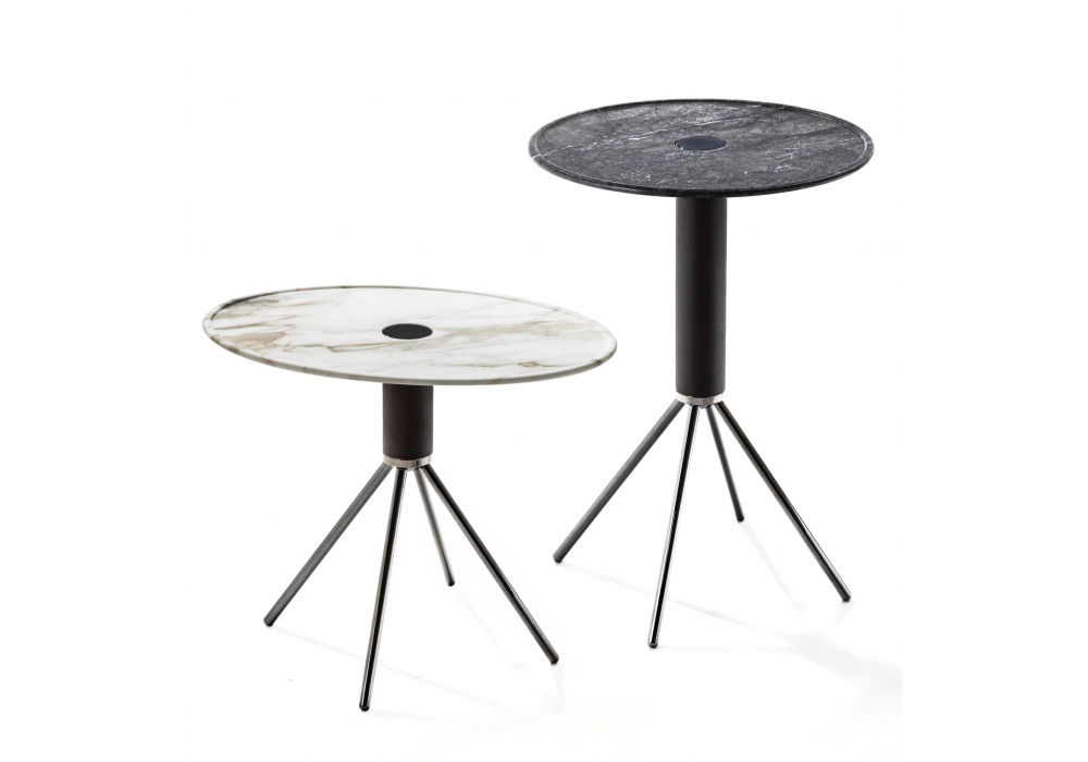 Jelly Marmo firmato da Carlo Ballabio per Porada è un tavolino con base in metallo cromo nero o ottone spazzolato. Piano in marmo con lavorazione ribassata finitura olio idro antimacchia nelle finiture bianco calacatta oro o grigio carnico. Colonna centrale in massello di noce canaletta o noce canaletta tinto wengè. Piano d'appoggio disponibile in forma ovale o rotonda, in due altezze.