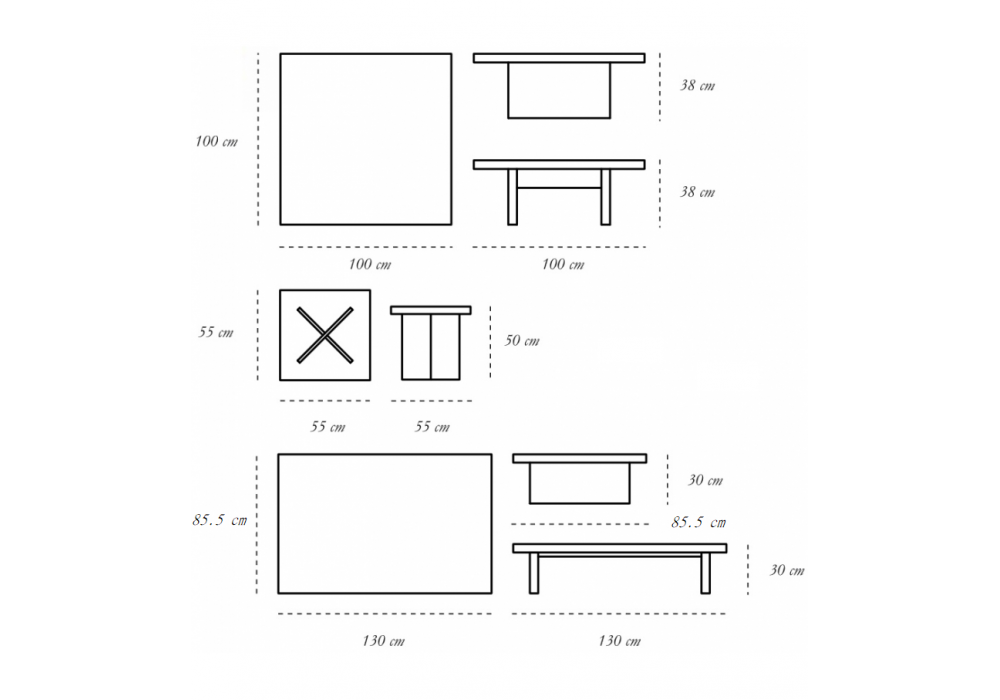 | Dimensioni | 130 x 85.5 x H 30 cm; 100 x 100 x H 38 cm; 55 x 55 x H 50 cm. |