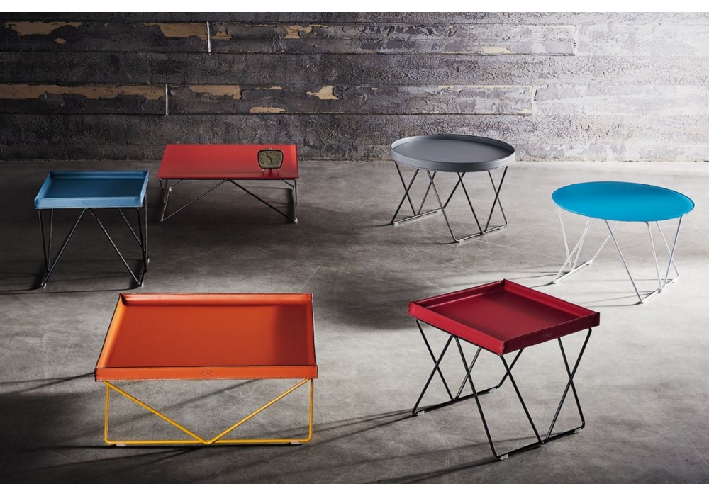 Flexus firmato da Contromano per Bontempi è un tavolino con struttura in acciaio e piano in cuoio disponibile in diverse finiture e dimensioni.