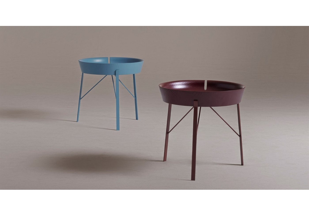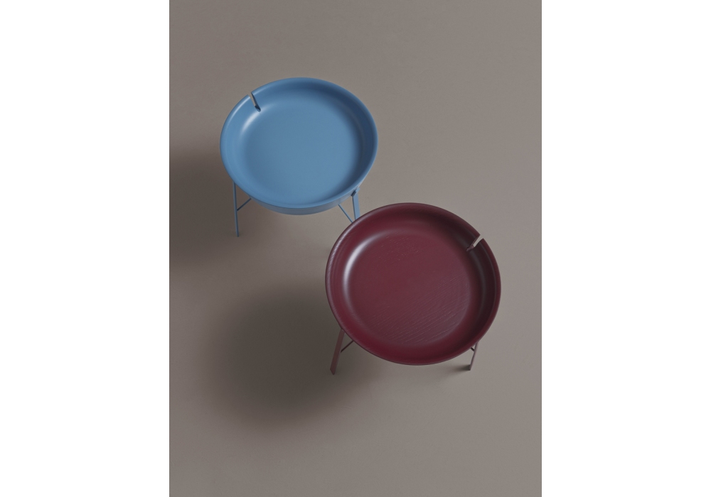 Cocoon firmato da Angeletti Ruzza per My Home Collection è un tavolino di forma circolare realizzato con struttura in piatto di acciaio verniciato o cromato e vassoio in massello di frassino laccato.