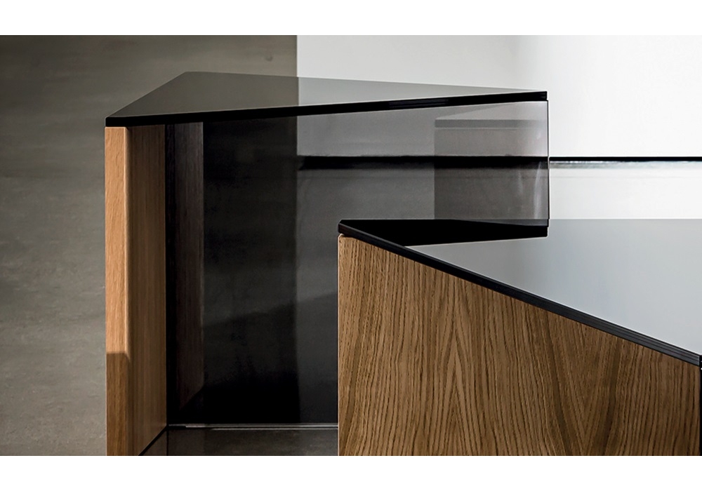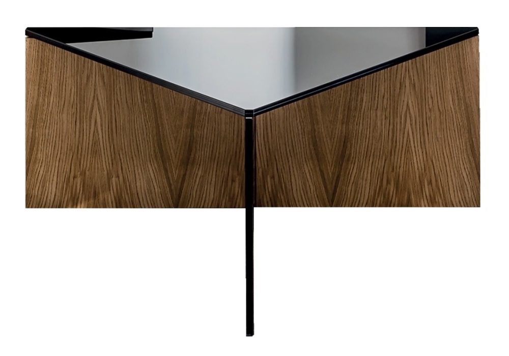 Regolo Triangolare firmato da Lievore, Altherr, Molina per Sovet è un tavolino realizzato con top in vetro stratificato nero o top in legno. Nella versione con top in vetro la base è composta da un elemento in vetro fumé e da un elemento in legno. Nella versione con top in legno la base è composta da un elemento in vetro fumé e un elemento in vetro stratificato nero. Disponibile in diverse finiture e dimensioni.