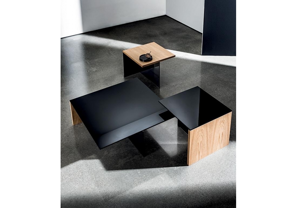 Regolo Quadrato firmato da Lievore, Altherr, Molina per Sovet è un tavolino realizzato con top in vetro stratificato nero o top in legno. Nella versione con top in vetro la base è composta da un elemento in vetro fumé e da un elemento in legno. Nella versione con top in legno la base è composta da un elemento in vetro fumé e un elemento in vetro stratificato nero. Disponibile in diverse finiture e dimensioni.