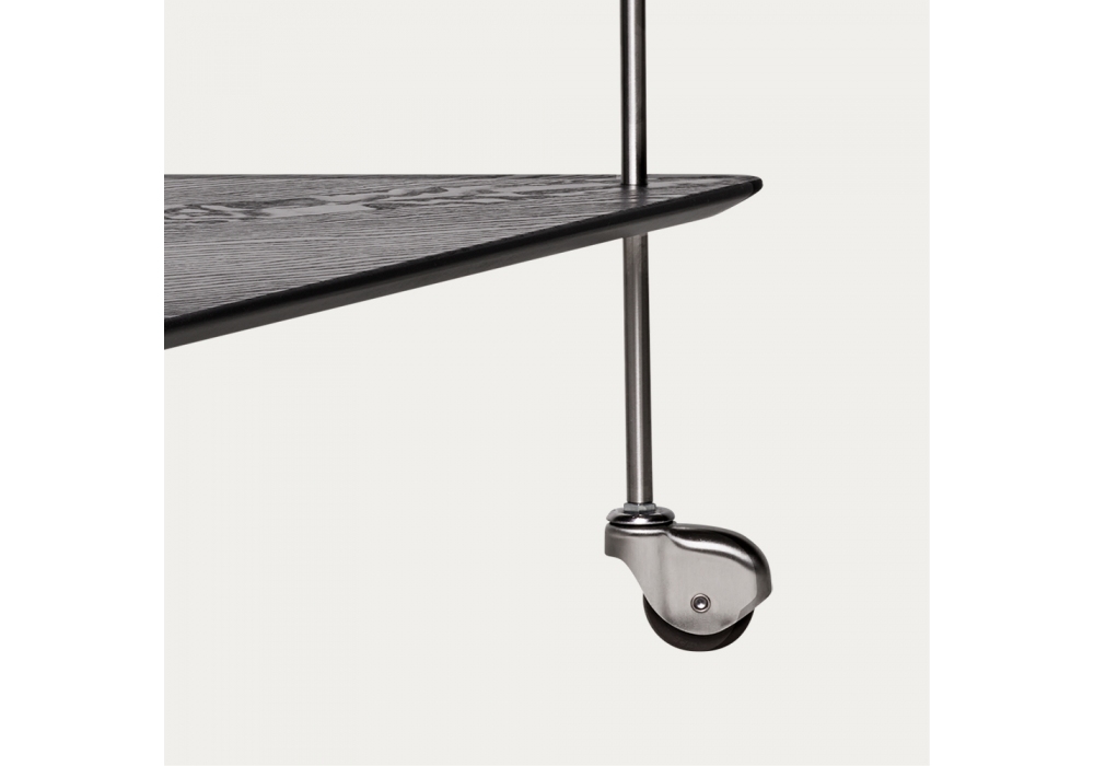 AJ Trolley firmato da Arne Jacobsen per Fritz Hansen è un tavolino / carrello con piani triangolari in frassino color nero. La struttura è in acciaio inox satinato e viene fornita con le ruote in metallo.