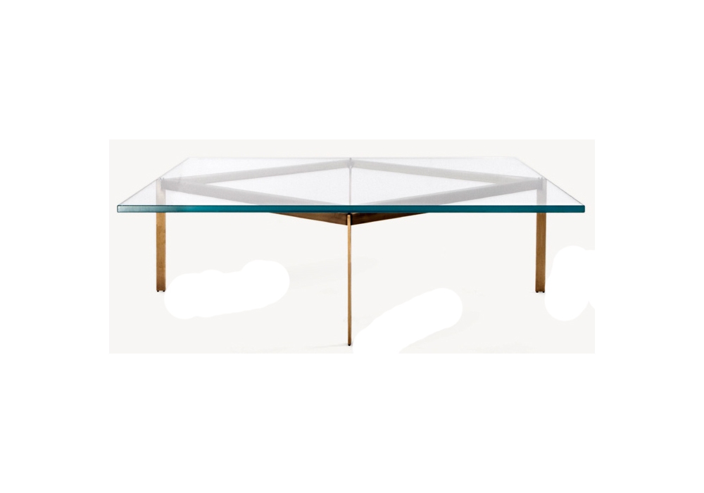 Plank tavolino disegnato da Craig Bassam per BassamFellows, top in low iron glass, sostenuto da una struttura quadrangolare in ottone ossidato o inossidabile o acciaio, il tutto sorretto da quattro piedi.