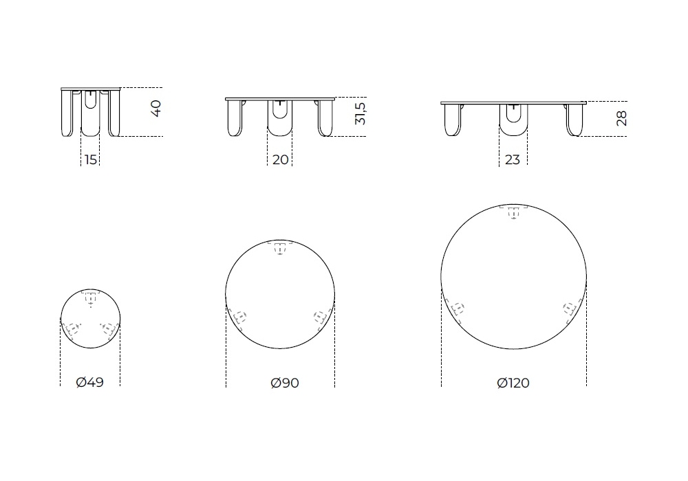 | Dimensioni | Ø 49 x H 40 cm; Ø 90 x H 31,5 cm; Ø 120 x H 28 cm. |