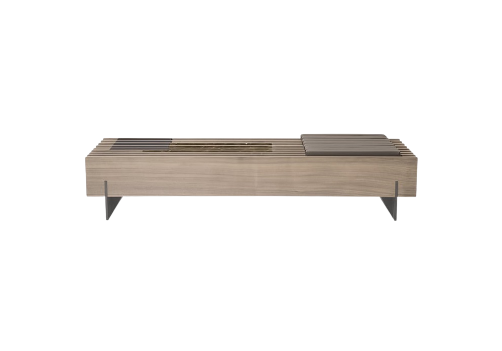Fit firmato da Giancarlo Bosio e Centro Ricerche per Giorgetti è un tavolino-panca con doghe in legno massello di noce canaletto e base realizzata in cristallo grigio temperato. La seduta è rivestita in pelle, in diverse finiture. Gli inserti sono disponibili in marmo o in metallo verniciato.
