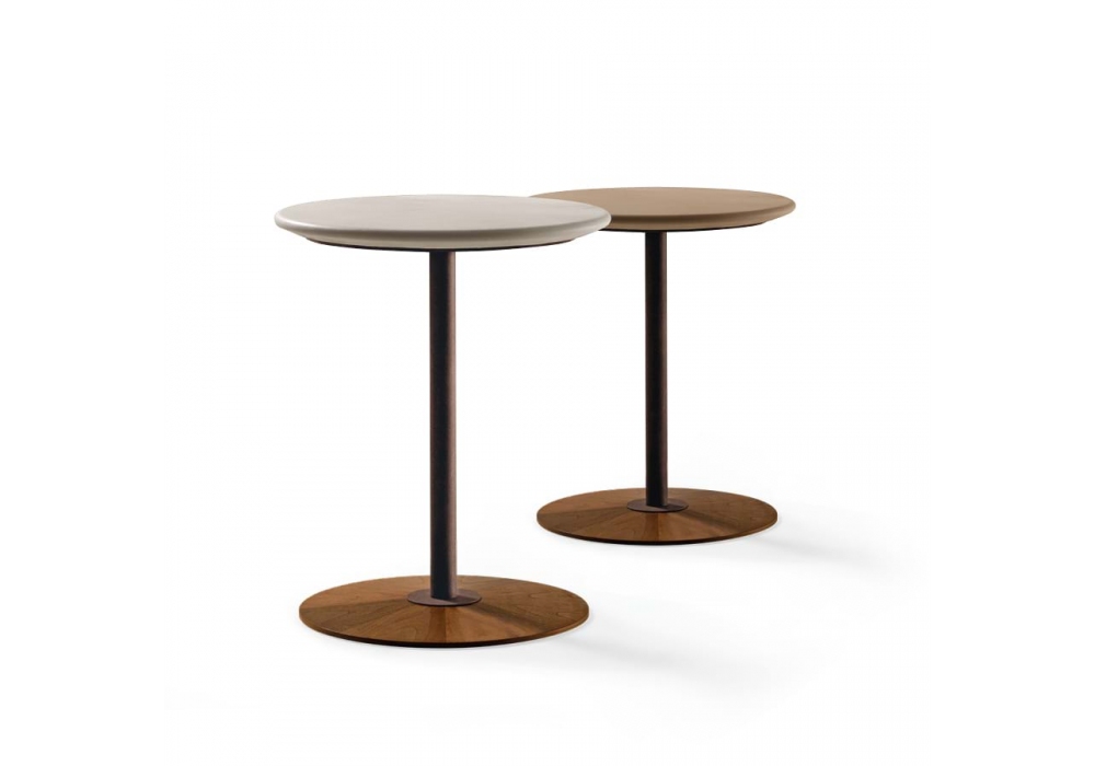 Magica firmato da Toshiyuki Kita per Giorgetti è un tavolino con il top in pannello di fibra di legno rivestito in pelle. La colonna è in metallo verniciato color bronzo e la base in noce canaletto, disponibile in diverse finiture.