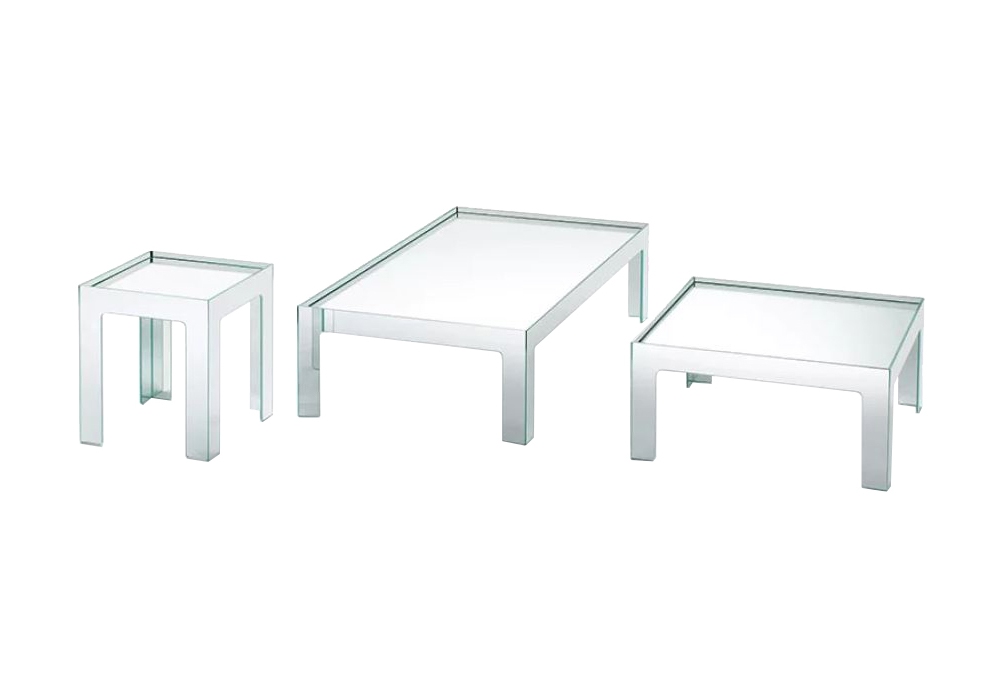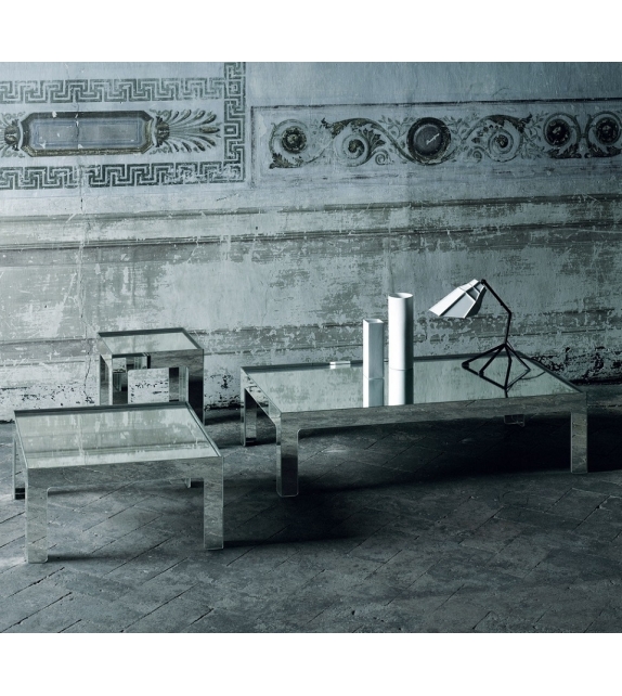 Mirror Mirror firmato da Jasper Morrison per Glas Italia è un tavolino disponibile in diverse misure, la cui base è realizzata incollando a 45° lastre di specchio stratificato bifacciale, tagliato a getto d'acqua. Il piano a specchio rimane ribassato all'interno della base, in modo da essere contenuto da un'alzatina.