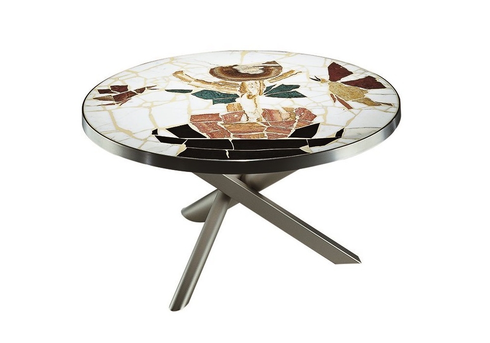 6860 Pompei firmato da Alik Cavaliere per Zanotta Edizioni è un tavolino con piano con decoro in tarsia di marmi policromi e struttura in acciaio sabbiato e nichelato.