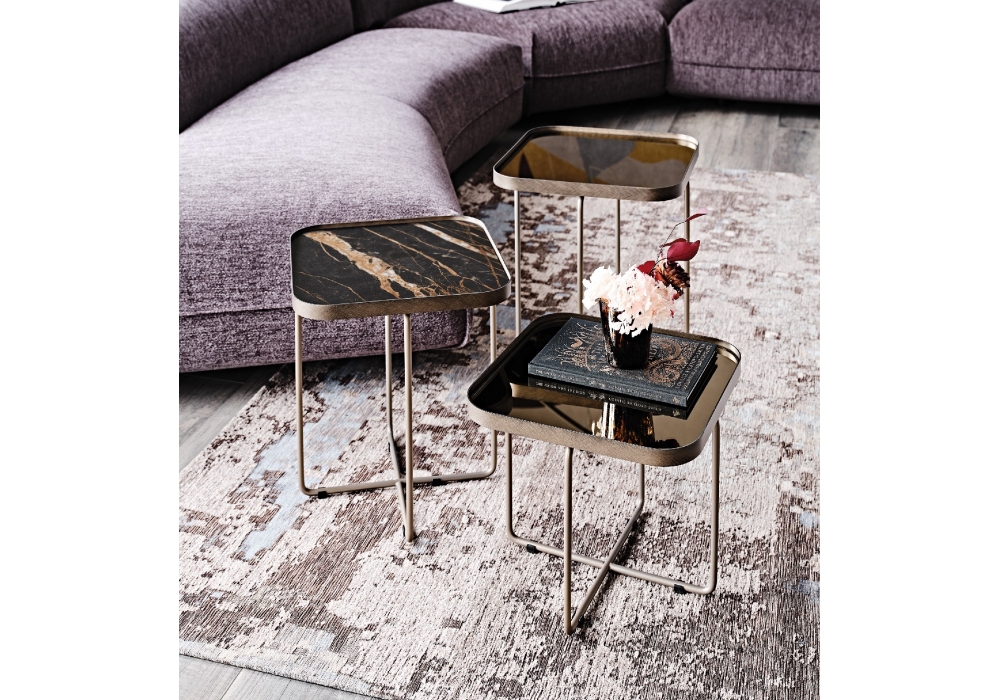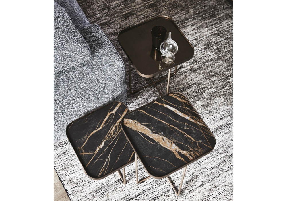 Benny firmato da Studio Kronos per Cattelan Italia è un tavolino basso con piano in vetro specchiato bronzo. Struttura in acciaio laccato goffrato nero o titanio o base in Bronze e cornice del piano in Brushed Bronze.