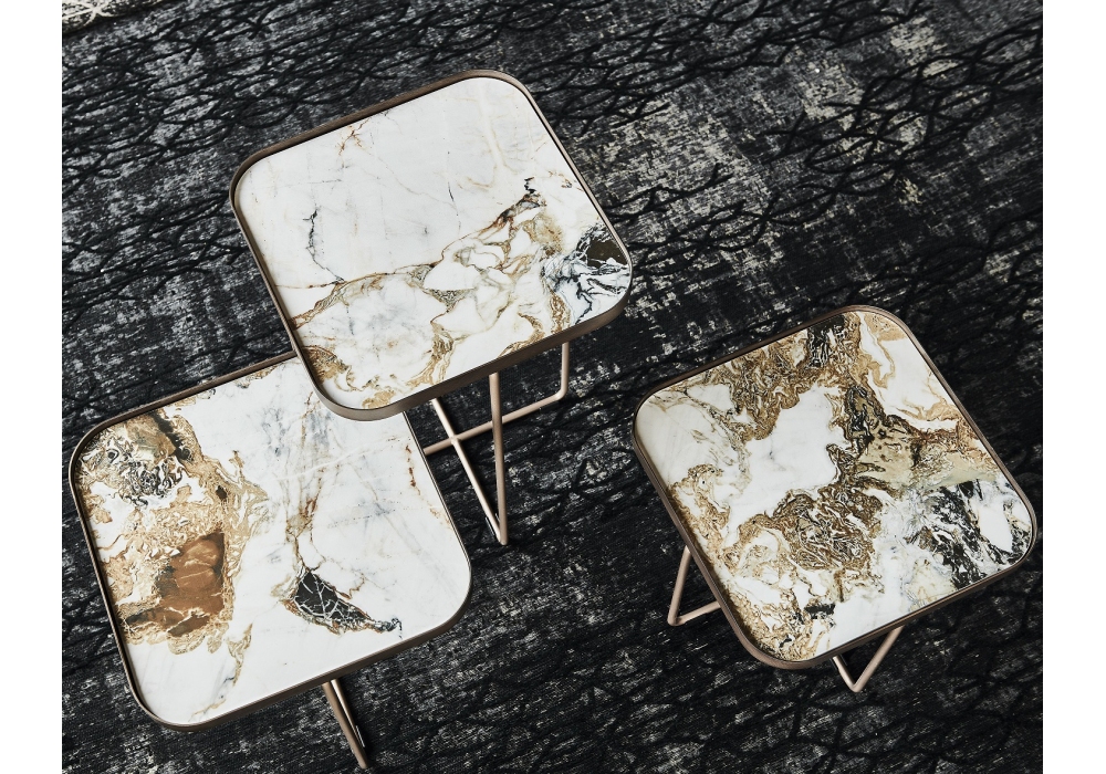 Benny Keramik firmato da Studio Kronos per Cattelan Italia è un tavolino basso con piano in ceramica Marmi in diversi colori. Struttura in acciaio laccato goffrato nero o titanio o base in Bronze e cornice del piano in Brushed Bronze.