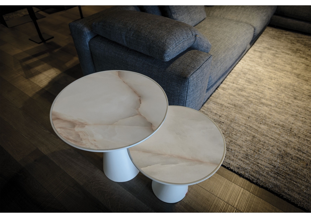 Peyote Keramik firmato da Piero De Longhi per Cattelan Italia è un tavolino basso con piano in ceramica Marmi in diversi colori. Struttura in poliuretano rigido verniciato bianco o titanio opaco.