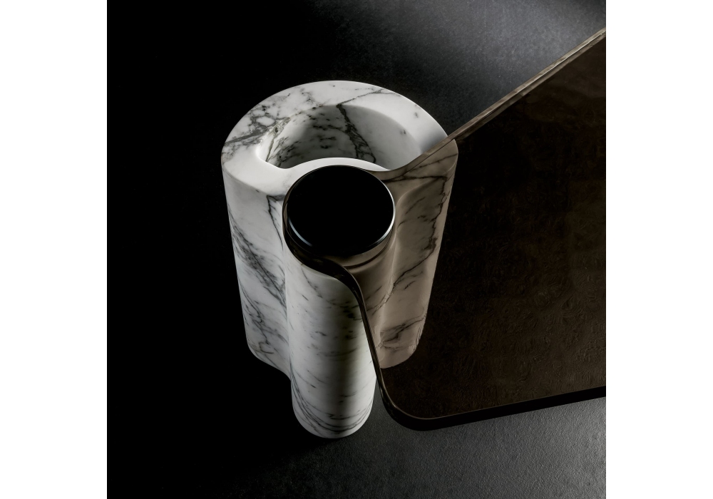 Plynto firmato da Ugo Cacciatori per Henge è un tavolino composto da base in pietra e piano girevole in fusione di vetro finitura Steel Grey.