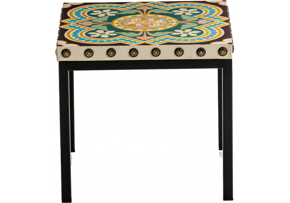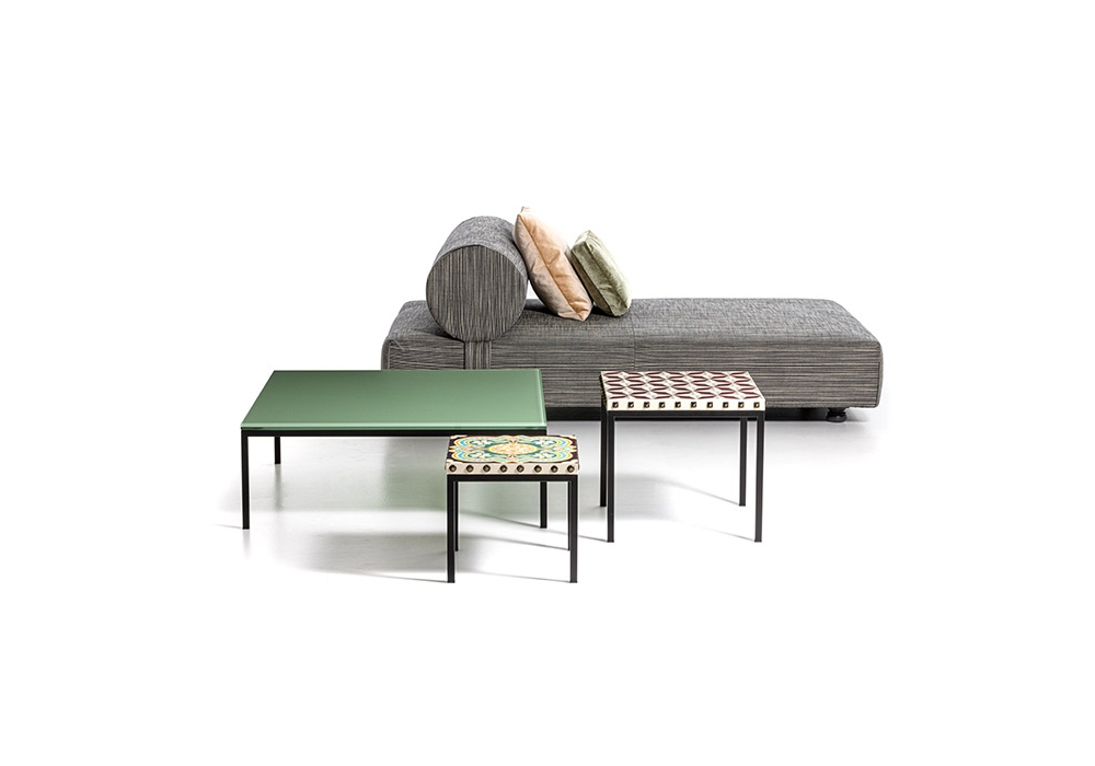 Not a Harem firmato da Annabel Karim Kassar per Moroso è un tavolino con Top in nobilitato con rivestimento in tela di cotone stampata e dipinta. Bordi decorati con borchie in acciaio. Base in acciaio verniciato a polvere.