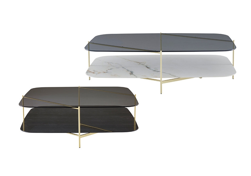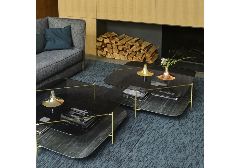 Clyde firmato da Numéro111 per Ligne Roset è un tavolino basso con struttura in acciaio, disponibile in 2 finiture. Piano superiore in vetro fumè grigio e piano inferiore in gres porcellanato con effetto marmo bianco o nero. Disponibile in diverse dimensioni.