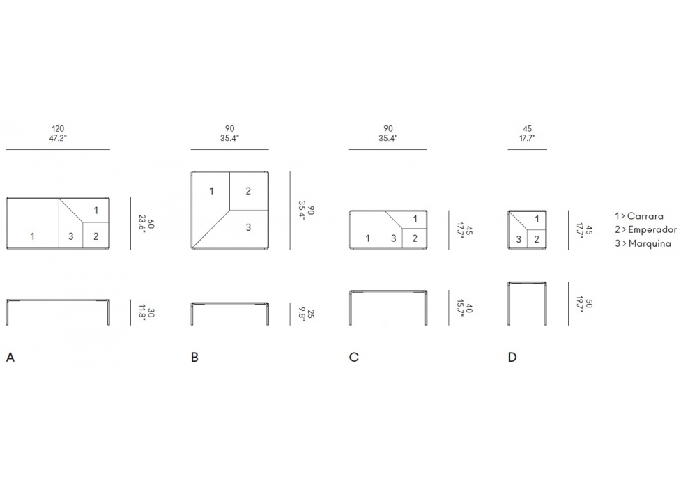| Dimensioni | 120 x 60 x H 30 cm; 90 x 90 x H 25 cm; 90 x 45 x H 40 cm; 45 x 45 x H 50 cm. |