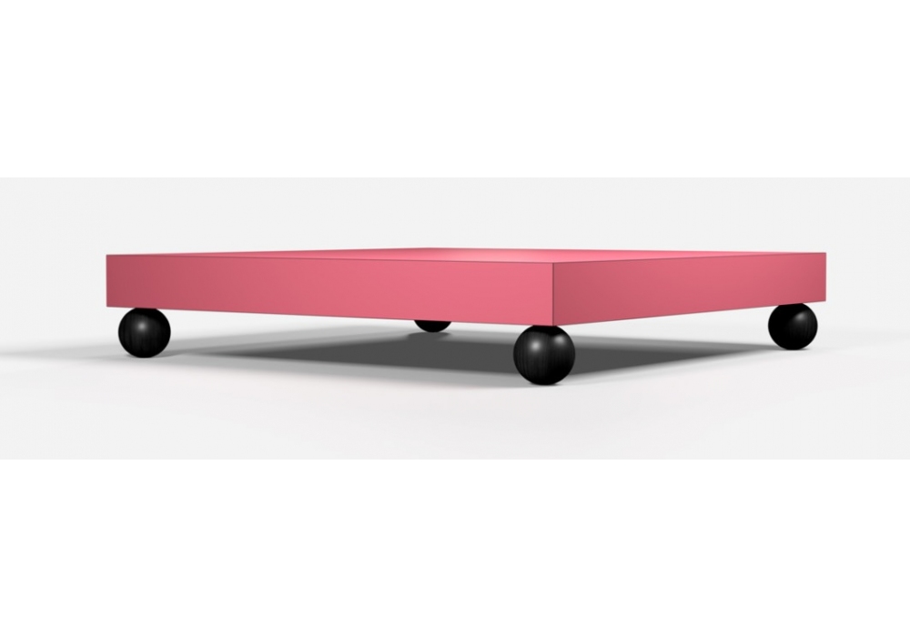 T02 firmato da Superstudio per Poltronova è un tavolino realizzato con piano in multistrato laminato rosa patrimonio e gambe in faggio tornito e verniciato nero.