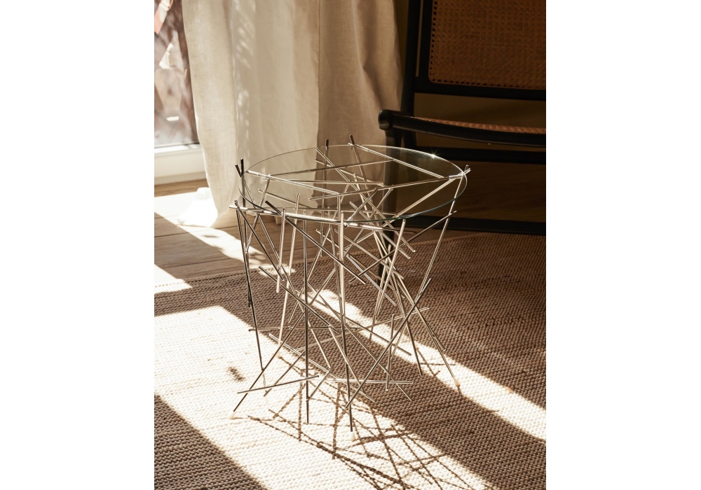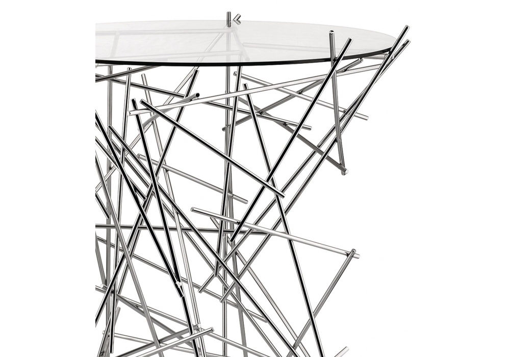 Blow Up firmato da Fratelli Campana per Alessi è un tavolino con struttura in acciaio cromato e piano in cristallo trasparente.